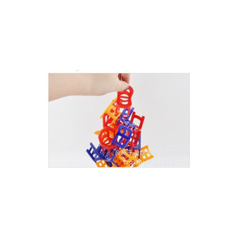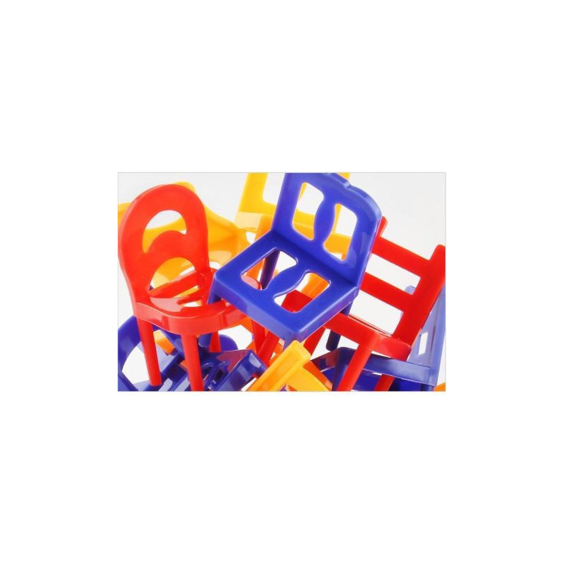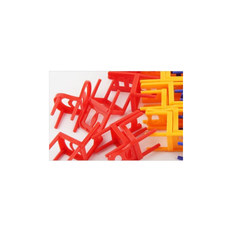 Tökéletes játék bármely bulihoz vagy összejövetelhez! Az indulás egyszerű, és rengeteg móka a játék. Bármilyen sík felületre könnyen felállítható. A játék célja a székek egymásra rakása anélkül, hogy felborulnának. Annyi különböző módon lehet egymásra rakni, hogy soha nem lesz ugyanaz a játék kétszer… nem beszélve arról, hogy a játék nehezebbé válik, ha egy kicsit beálltál ! Kezdésként szórja szét a különböző színű és alakú székeket a játékfelületen. Döntse el a lejátszandó körök számát, helyezzen egy széket a játékfelületre, és kezdje el felváltva egy széket hozzáadni a szék kupachoz.
