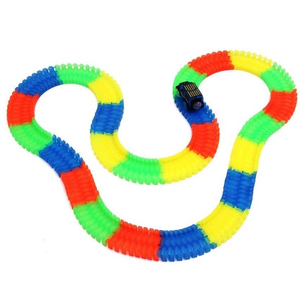 Az építhető versenypályához tarozik egy LED-es kisautó is, így sötétben még izgalmasabb lehet a játék.