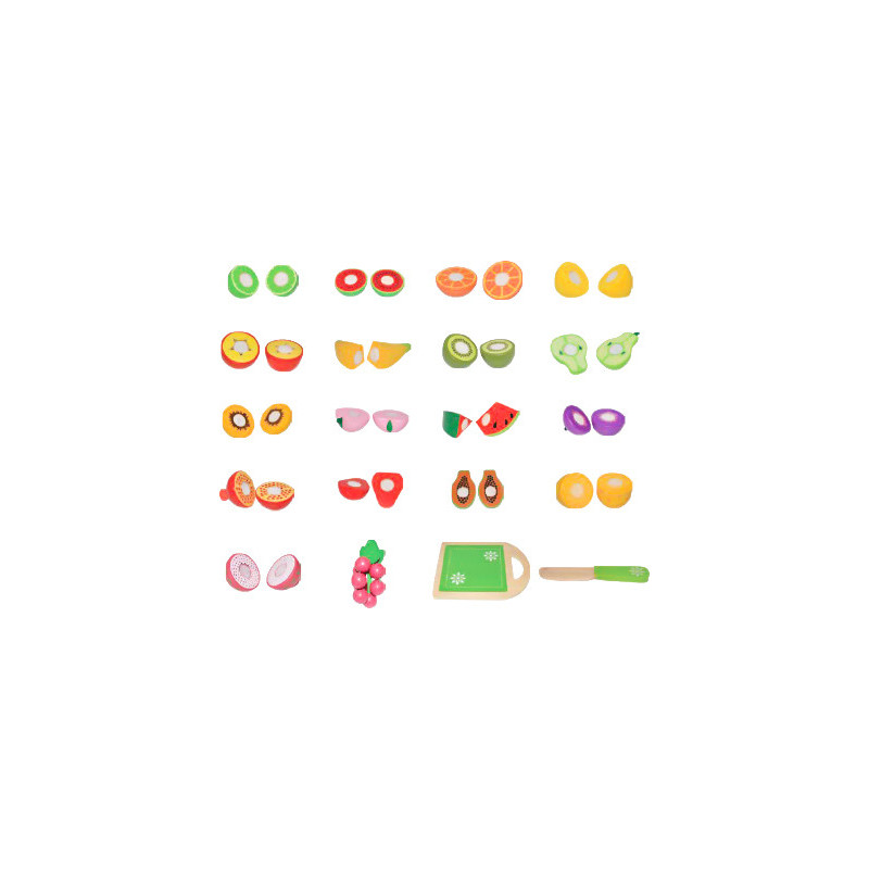 FA GYÜMÖLCSÖK VÁGÁSHOZ Az összes készlet elem fa anyagból készült és gyermekbiztos festékkel van bevonva. A gyümölcsök mellett a készlet tartalmaz egy fa tálat és egy vágókést. A gyümölcsök félbe vannak vágva, Velcroval összekapcsolva, ami enyhe ellenállást biztosít a vágáskor és olyan hangot ad, mint amikor valódi gyümölcsöt vágunk. Minden egyes darabot nagy figyelemmel és gyermekbiztonsággal készítettek, a játék mentes a veszélyes elemektől és élektől.