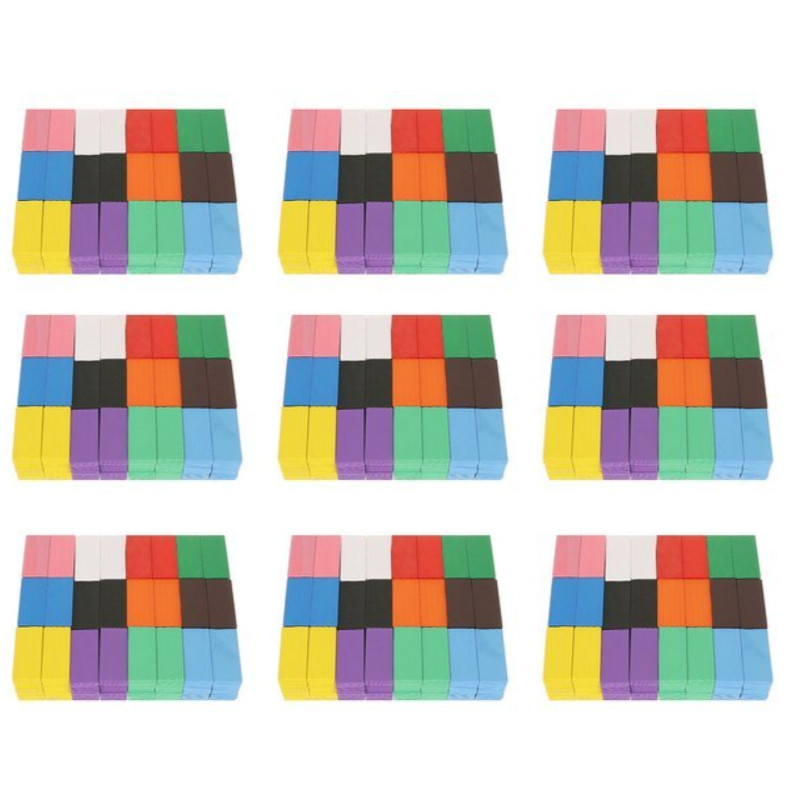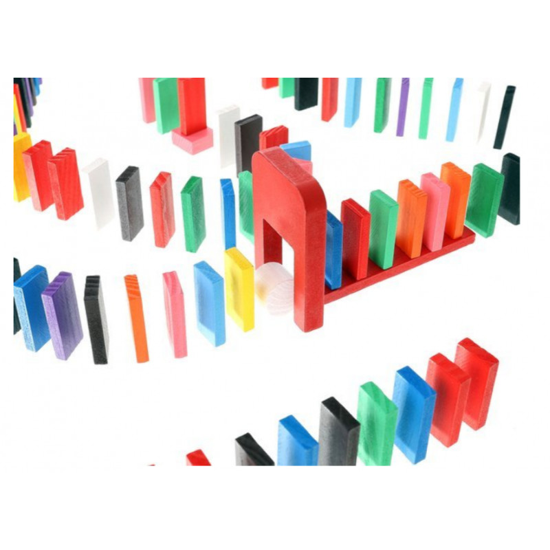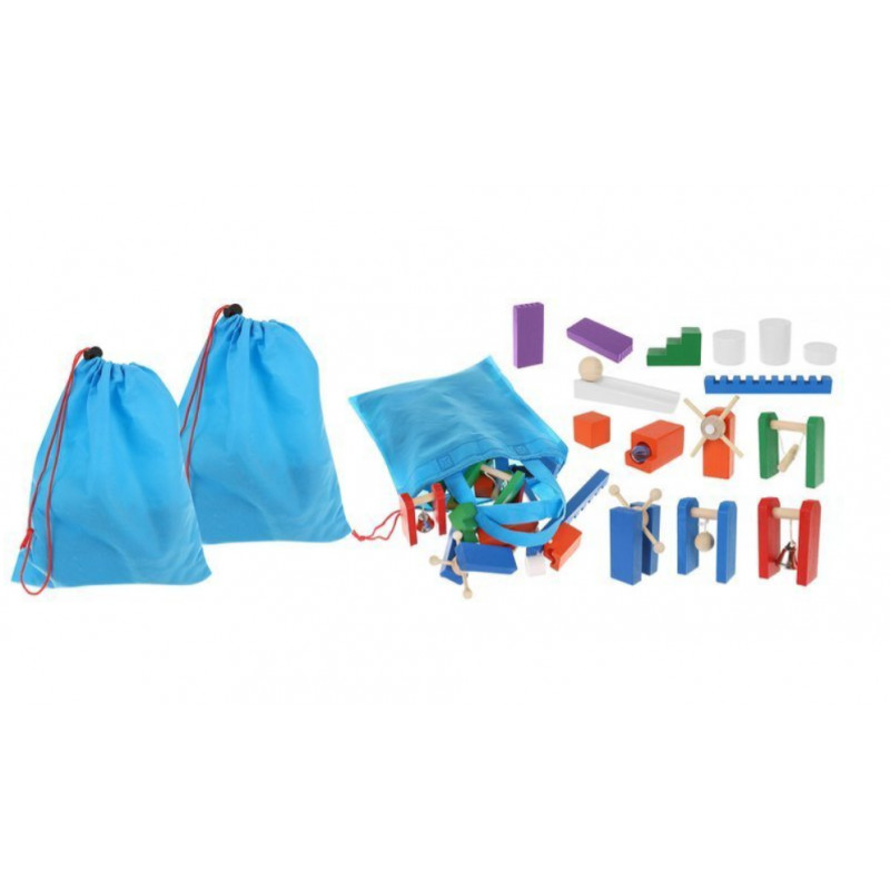 A készletben 1131 elem található. 1080 dominó amely 12 színű ( barna, fekete, 2 árnyalatú kék, narancs, piros, rózsaszín, sárga, lila és fehér), 45 további elem különböző formákban és 3 golyó. A készlet 3 táskát is tartalmaz húzózsinórral a készlet tárolására és szállítására. Gyönyörű, élénk színe van, amely fejleszti gyermeked fantáziáját és kreativitását. A játék egyben a kézügyesség és a szem-kéz koordinációját is fejleszti.