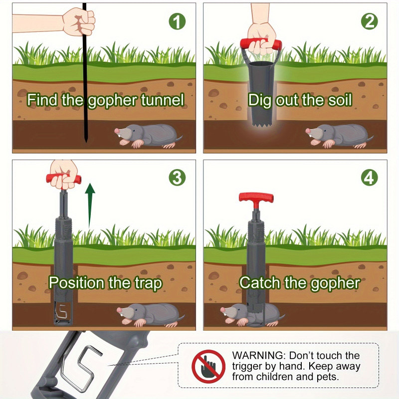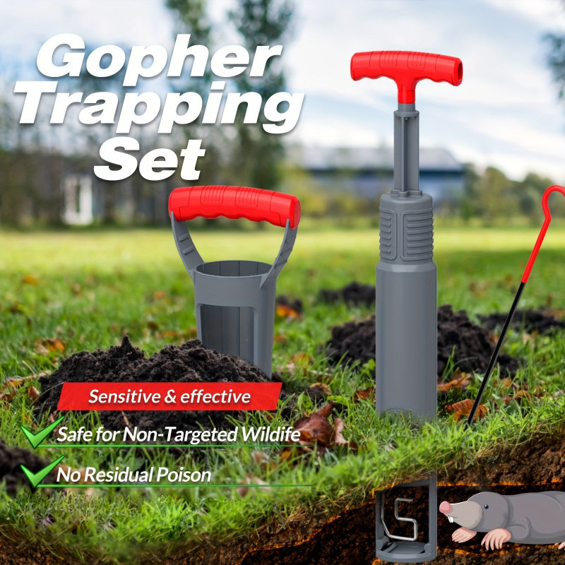 (Készlet tartalma) A szett tartalmaz egy Gopher Trap-ot, egy ásót és egy szondát, amelyek segítségével könnyedén felszerelheted és használhatod a csapdát.