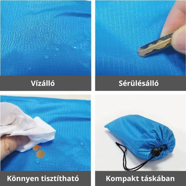 Termékünk víz- és sérülésálló, így nem kell attól tartanod, hogy a nyirkos fű átáztatja, valamint az apróbb kavicsok, ágak sem tesznek kárt benne. Bátran magaddal viheted egy erdei piknikre, de akár a strandra is. Egy hordtáskát is kapsz hozzá, hogy könnyedén magaddal vihesd bárhova.