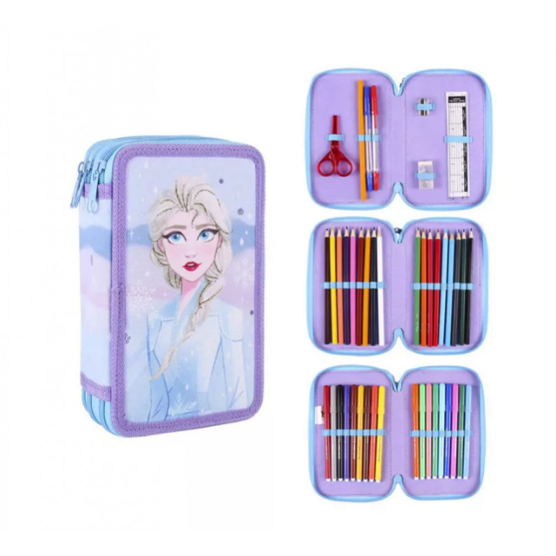 Három emeletes, felszerelt ”Jégvarázs Elza” tolltartó. Kiváló minőségű olasz Giotto ceruzákkal és filctollakkal van feltöltve. Olló és vonalzó is található benne, így technika órára nem kell külön felszerelés. Nagy tárolókapacitásának köszönhetően illetve felszereltsége miatt, kényelmes társa lesz gyermekednek.