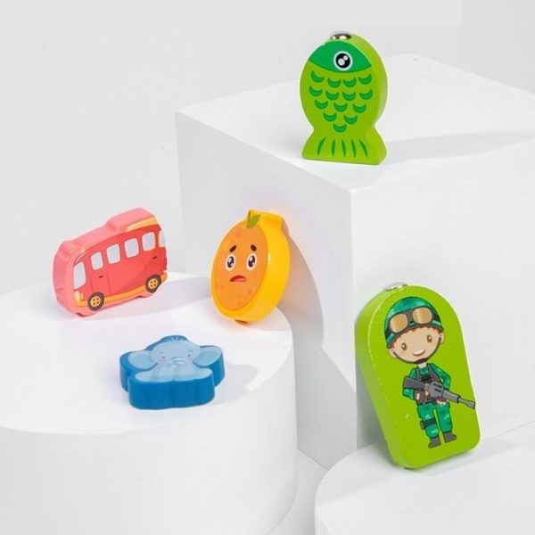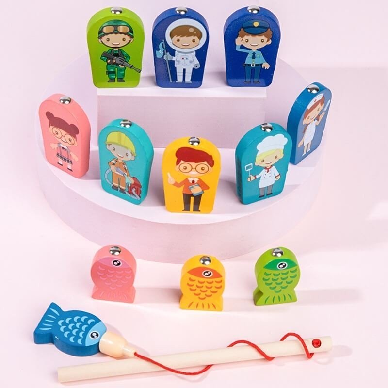 Ez még nem minden! Ugyanis a tábla felső sorában elhelyezett elemek mágnessel vannak ellátva, és a készlethez egy ”horgászbot” is tartozik, mellyel kifoghatja gyermeked például az általad mondott foglalkozást vagy egy kis halat, így még mókásabbá téve a tanulást.