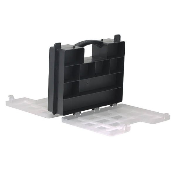 A táska átláthatóságát az átlátszó fedele biztosítja, így nem kell majd órákat keresgélned mire megtalálod amit éppen keresel. Mindkét oldalába tudsz pakolni dolgokat. Az egyik oldalán fix 14, a másik oldalán pedig fix 9 tárolóhely található, melyekben a tárolófelület különböző méretűek. A szerszámaid biztonságát a minőségi kivitel garantálja, hisz ütésálló műanyagból készült a rendszerező.