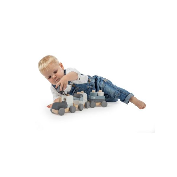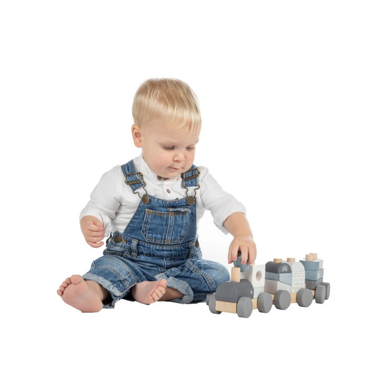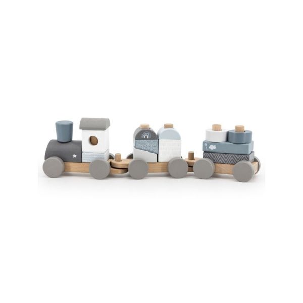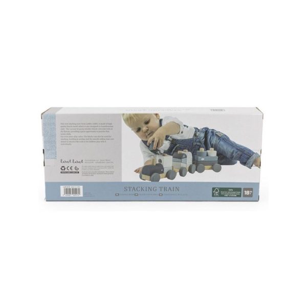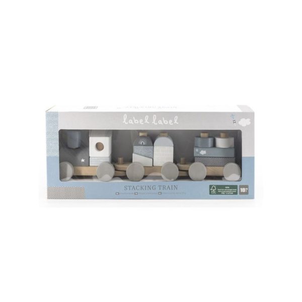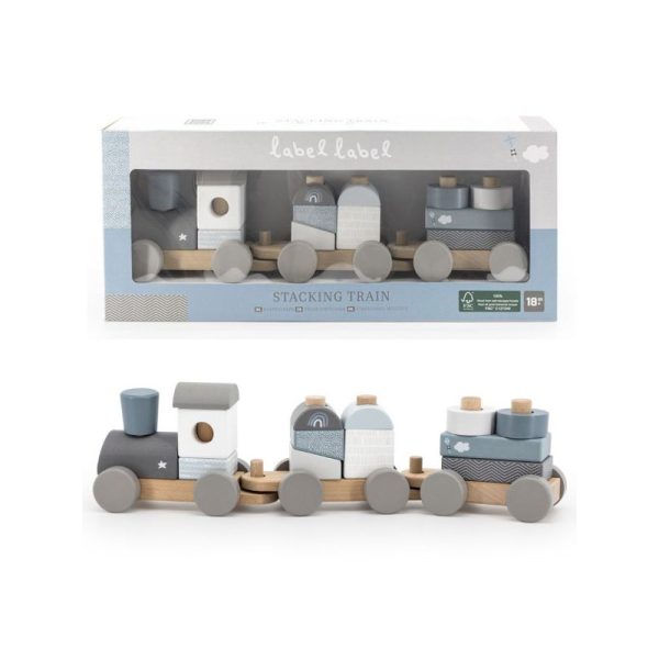 Label-Label pasztell kék színű, igényesen kidolgozott, fából készült játékvonat. A játék tologatása és építése is szórakoztató elfoglaltság a kicsik számára. A dobozban egy 3 vagonból álló, összekapcsolható vonat, valamint több különböző formájú (pl. henger, hasáb) és színű építőelem rejlik. Az építőelemek közepén lyuk található, így ráhúzhatók a vagonok rúdjaira, ezáltal tologatás közben sem esnek le.