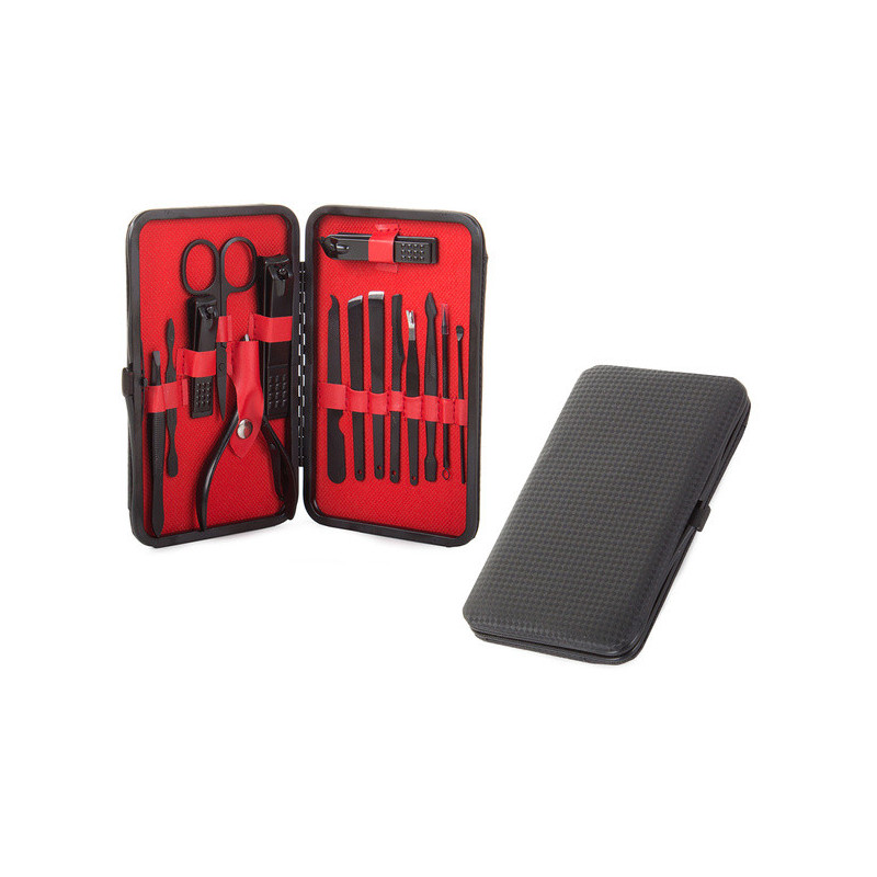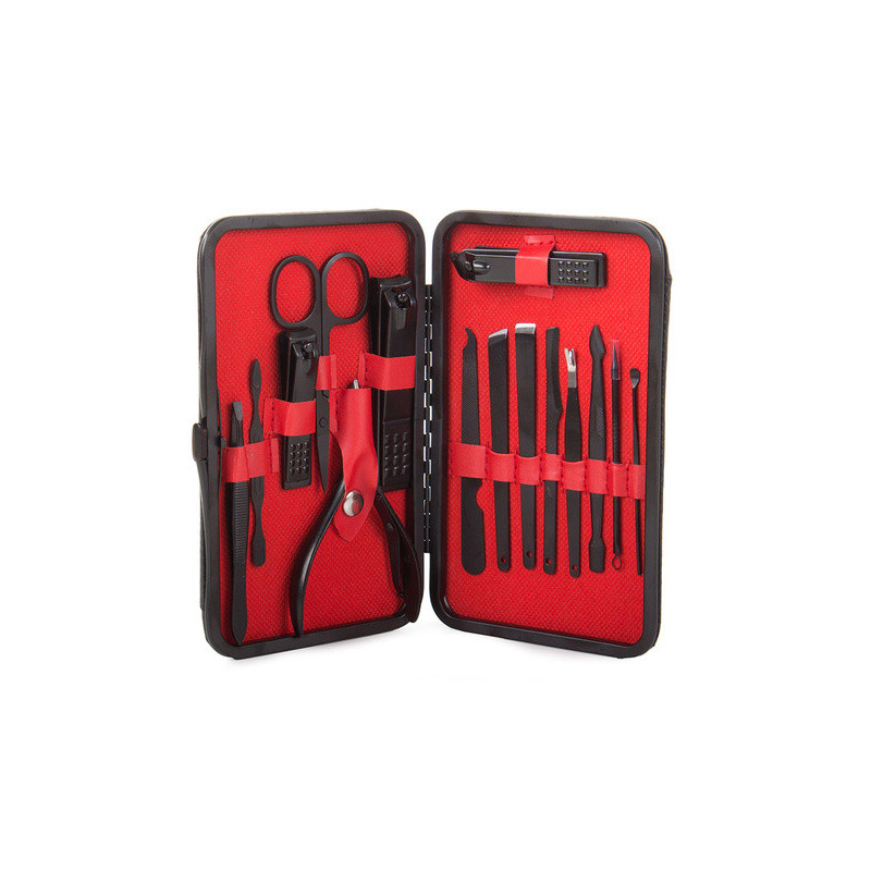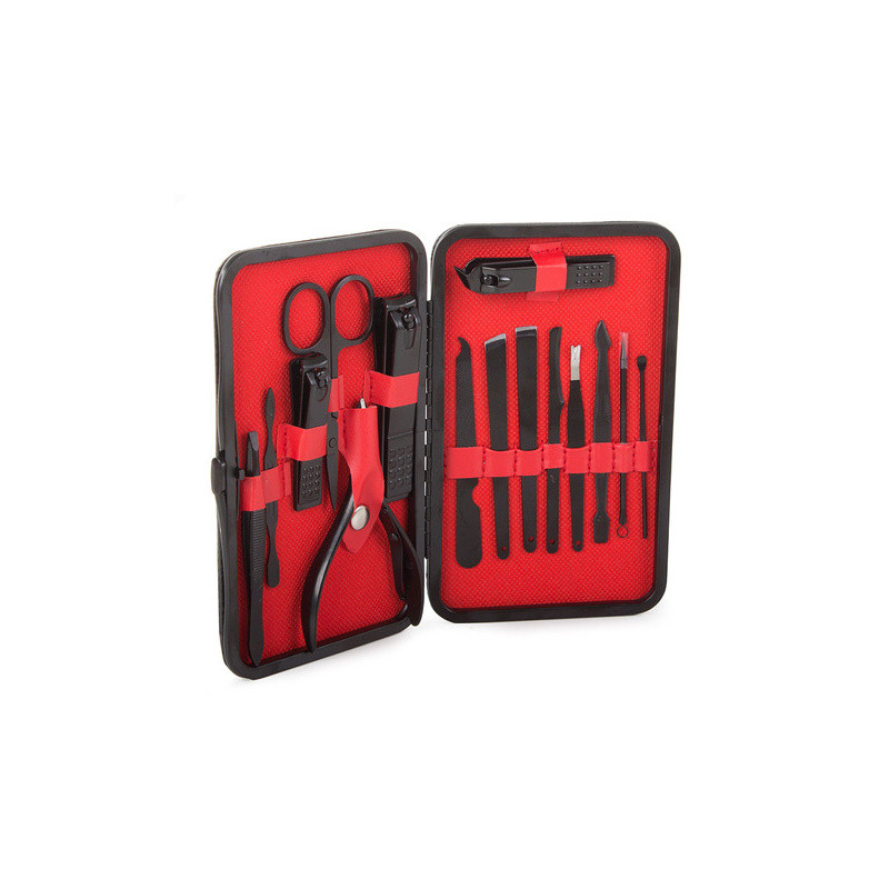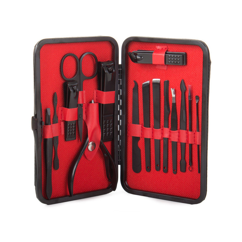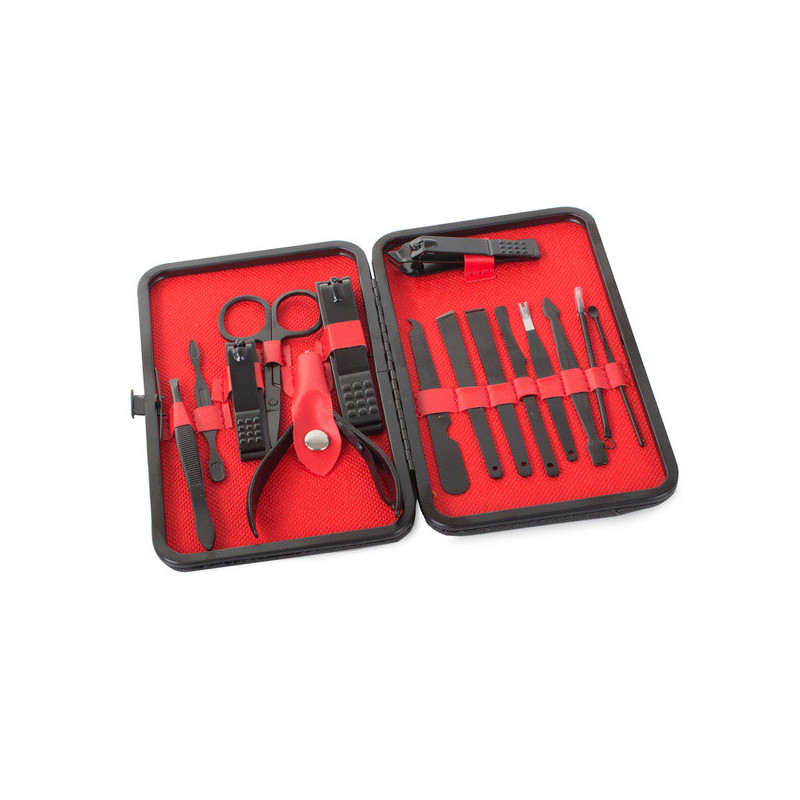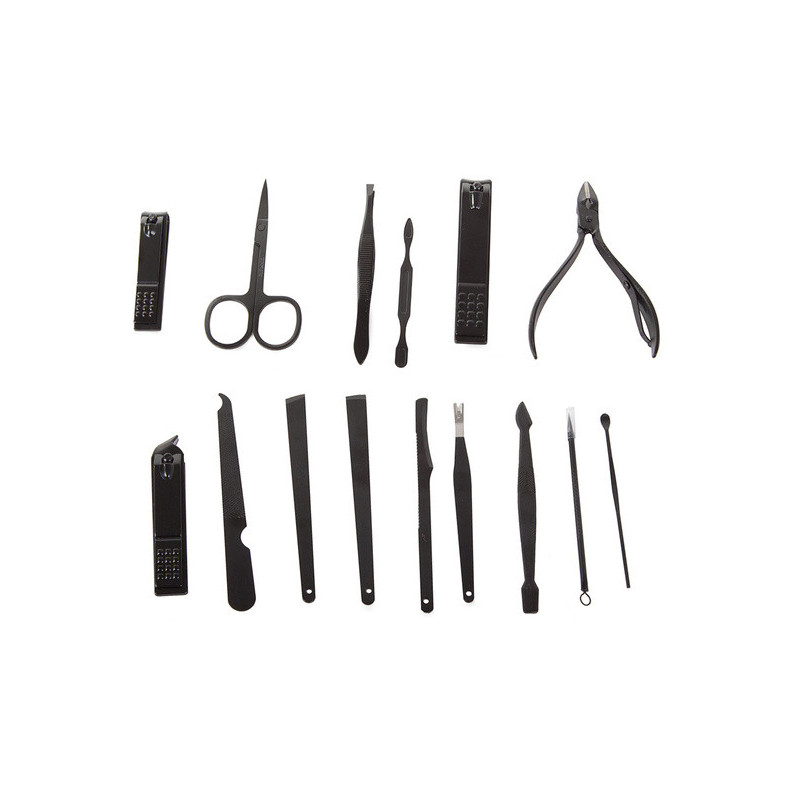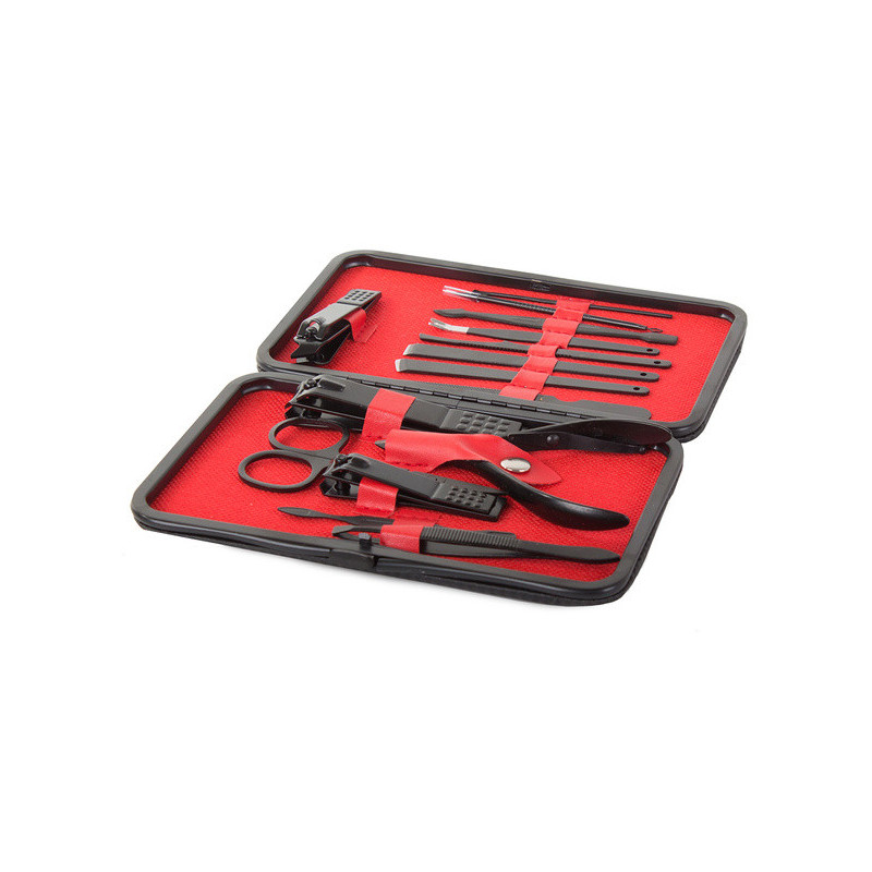Termékleírás: Ez a manikűrkészlet minden csajszinak kötelező darab! A készlet tartójában 16 különböző eszköz található, amelyek mindegyike tungsten acélból készült. A készlet tartós és ellenáll az elszíneződésnek. Az anyag hipoallergén, így nem okoz irritációt. Az egész készlet egy elegáns fekete tokban található, minden eszköznek külön helye van. Praktikus és könnyen pakolható kézitáskába, hátizsákba vagy utazó kozmetikai táskába. A készlet tartalmaz számos eszközt a körömápoláson kívül arcápoláshoz is.