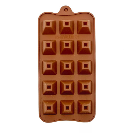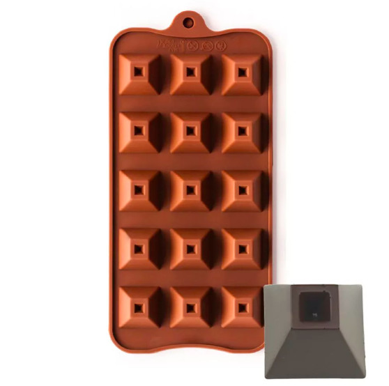 Rugalmasságanak köszönhetően a csokoládé könnyen kifordítható. A piramisok mérete: 23 x23 mm.
