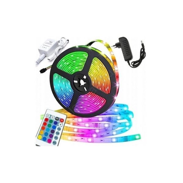 A 5 méteres RGB színes LED szalag egy rugalmas belső térben használható LED szalag, amely rendelkezik öntapadós hátoldallal. A szalagon 120 fokos megvilágítási szögű RGB SMD LED-ek találhatók, amelyek lehetővé teszik a színkeverést. A szalag 3 LED-enként működik 12 V stabilizált feszültséggel, és darabolható is 3 LED-enként. A csomag tartalmazza a 5 méteres színes led szalagot, egy távirányítót, egy távirányító érzékelőt és egy 12 V-os tápegységet. A szalag piros, zöld és kék színekben világít, és állítható a fényerő, a szín és a fényjáték is. Ideális domború felületek, polcélek vagy peremélek dekorációjára.