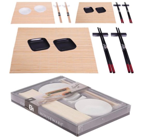 A készlet két készlet bambuszpálcából, két pálcatartóból, két szójaszószos tálból és egy bambuszszőnyegből áll.