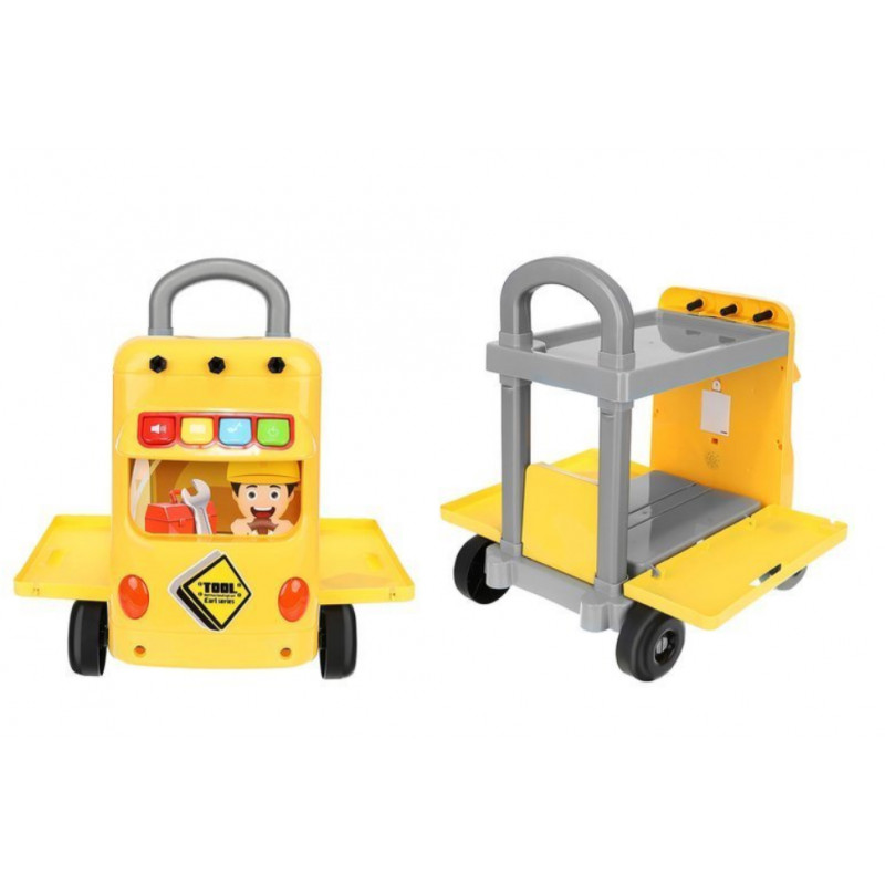 Ez a nagy funkcionális kocsi szerszámokkal érdekes és oktató játék a barkácsolás legfiatalabb rajongóinak. Két funkciója van, lehet egy műhely és egy közönséges kocsi, amelyben a gyermeked hordozza a játékait. A készlet tartalmaz kalapácsot, akkumulátoros fúrót, fűrészt, csavarkulcsot, fogót, kombikulcsot, csavarokat, léceket és rendszerezőt. A kocsi alsó rész lehajtott oldalakkal rendelkezik, aminek köszönhetően dobozként használható szerszámok tárolására. A kocsi elején játszópanel került elhelyezésre. Négy színes gomb van rajta, amelyeknek köszönhetően különféle hangokat és dallamokat játszik le. Köztük van az egyik leghíresebb dallamok ”Happy Birthday” 3 rövid mese angolul és kürt és autó hangok, a jármű két első lámpája os világít, ha hangot ad ki.