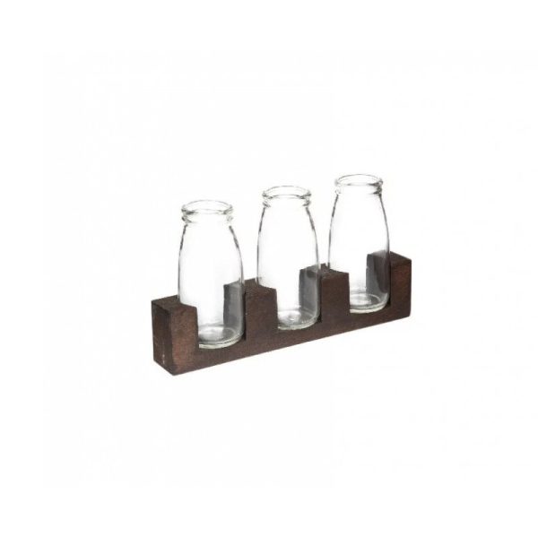 Elegáns és stílusos üveg váza szett fa állvánnyal, amely a belső térét feldobja. A három részes választék lehetővé teszi, hogy különleges kompozíciókat hozz létre virágokkal vagy dekorációval. A magas minőségű üveg és a természetes fa állvány egyaránt hozzájárul a dizájn exkluzív megjelenéséhez.